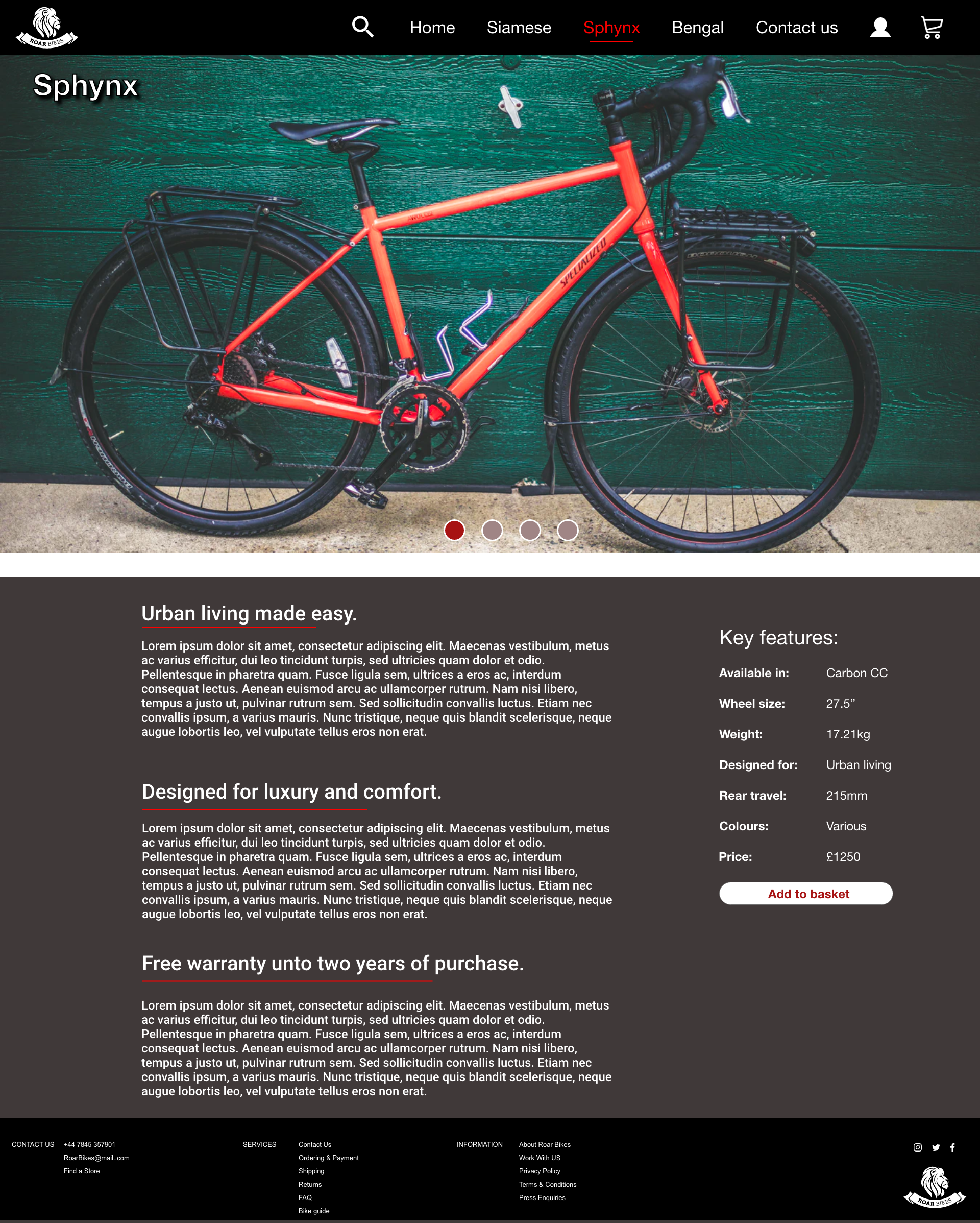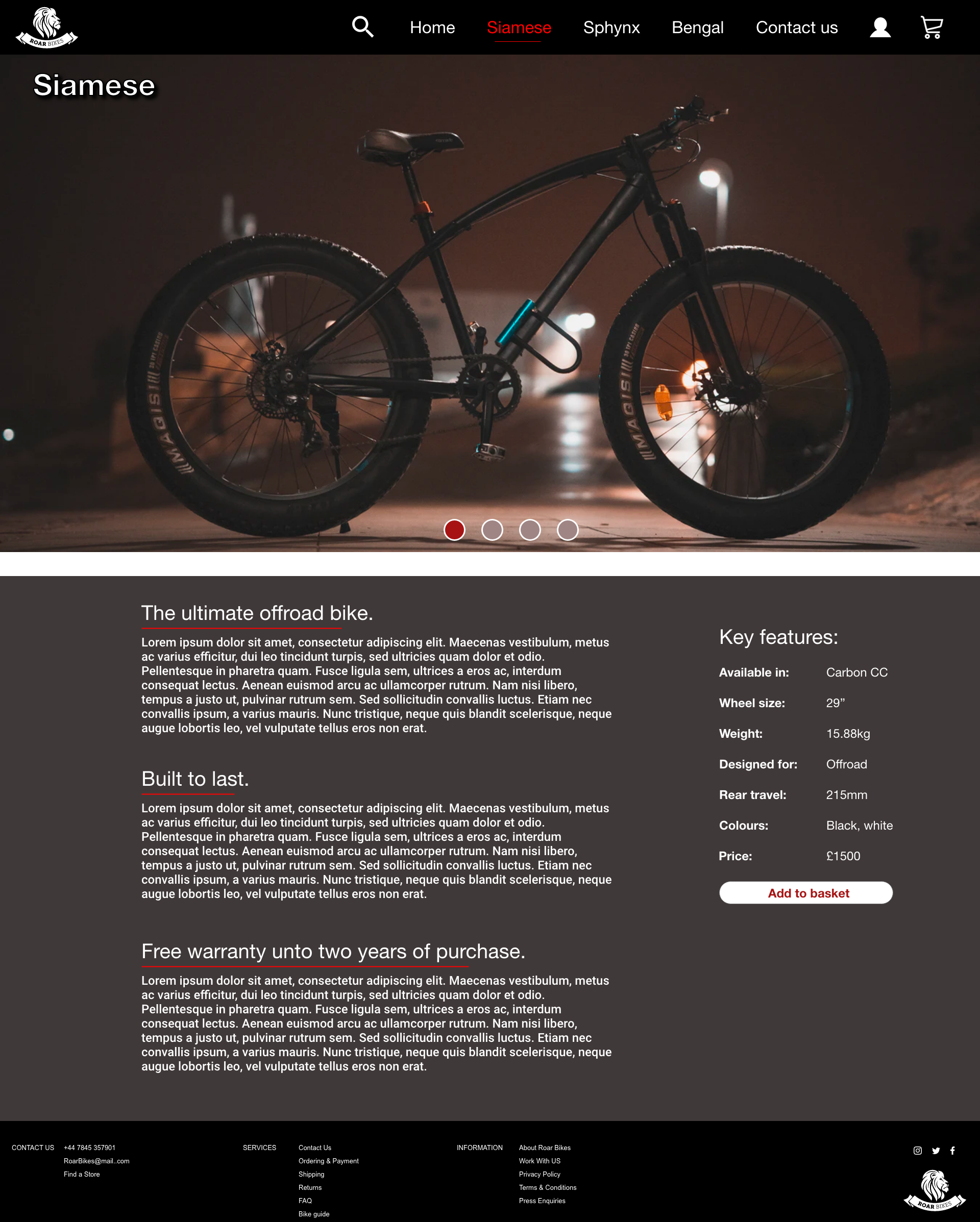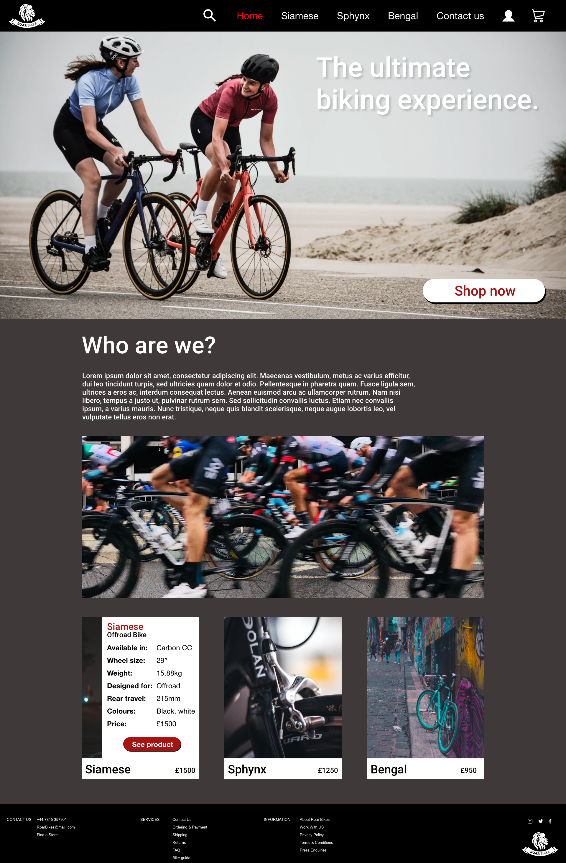 My second UX webpage design for fictional bike company Roar Bikes. This project utilised a range of skills within Adobe XD to create a professional looking webpage with interactive elements.